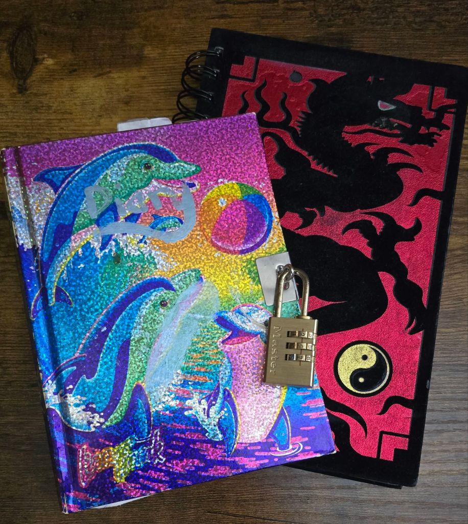 Through journaling, and reviewing old journal entries, I have been able to remind myself that even as the unnatural gravity of stress presses down, I am strong enough now that it doesn’t cause me total collapse like before. Journaling (and now blogging) has been a focus for me since childhood, always eager to chronicle my existence, my own autobiography of primary sources, something indelible that proves I existed – that I lived. From the Lisa Frank Sparkle-Dolphin diary with categorically overkill combination lock, to the suitably gothy velvet black dragon with impractical black paper journal, and endless other notebooks 10-40% filled, I have proof of what it was like where my memory blurs the lines or where traumatic experiences were blotted out completely.