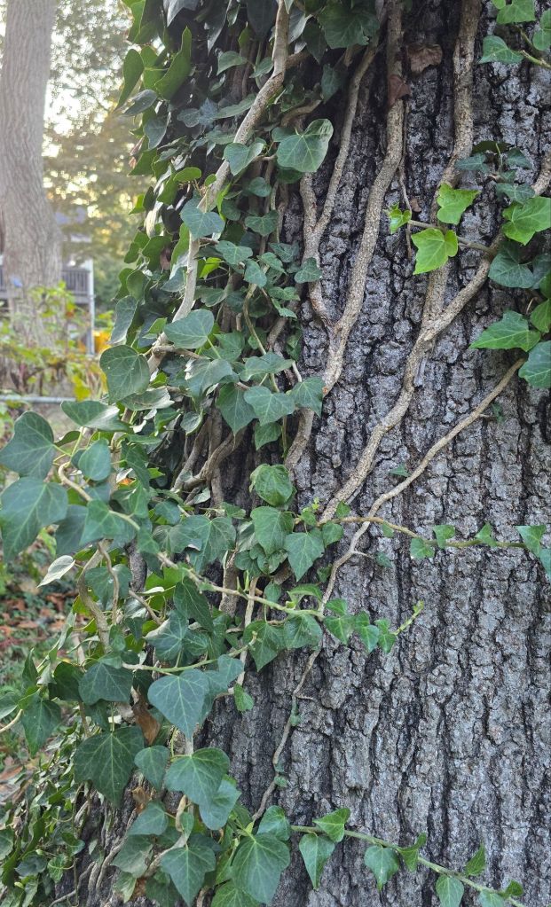 I’ve been doing the things that I have learned with experience are helpful to regulate my nervous system and bring my body back into balance, which I’ll describe not just to remember but also to share, possibly with some repeats, in case any treasured reader may benefit. It starts with breathing exercises, specifically square/box breathing. Inhale a 4-count, hold for 4, exhale for 4, hold for 4 and repeat. Daily, I’m making sure to take in even more water and invest in nutritional improvement like green smoothies, particularly helpful when my stomach feels like a fist and the idea of eating or cooking sounds like a curse. Slow time has been spent out back appreciating the sunlight filtering through the autumn leaves, tracing the maze of vines that climbs the thick sentinel trees along the fence with my fingertips.