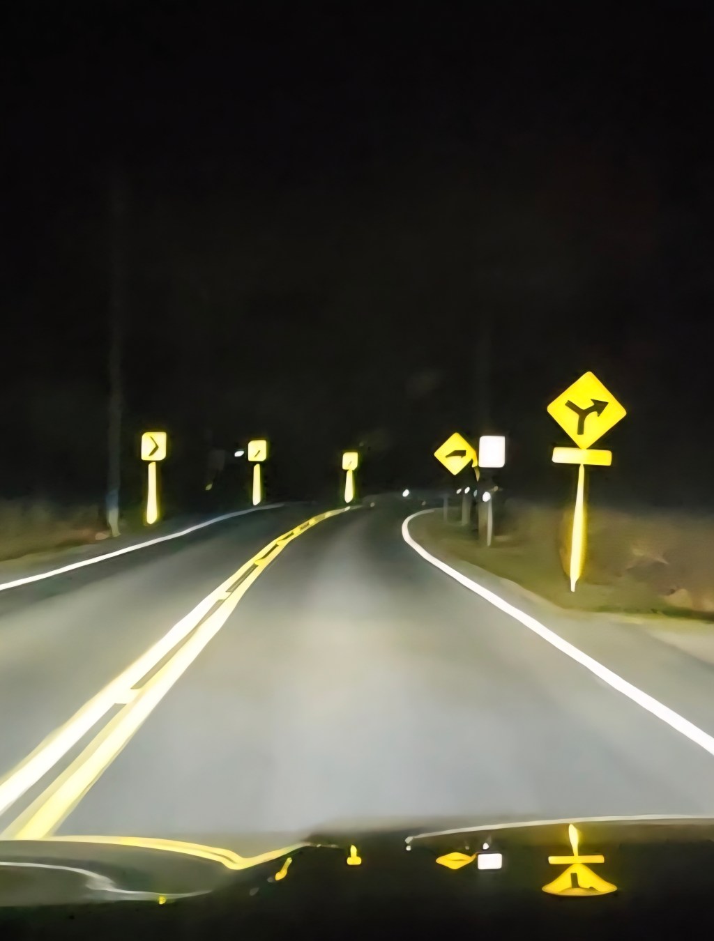 High beams shine, twin candles blind